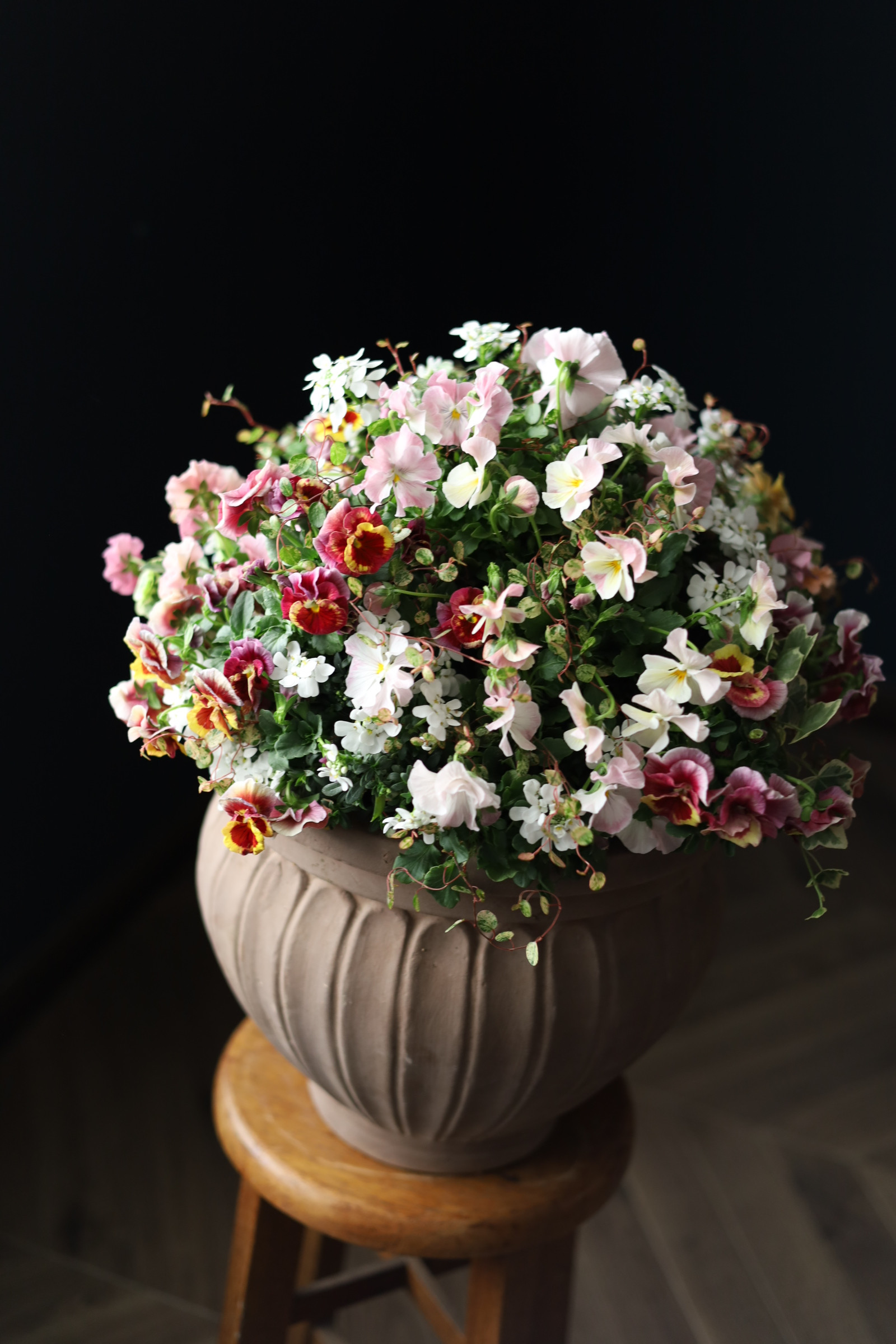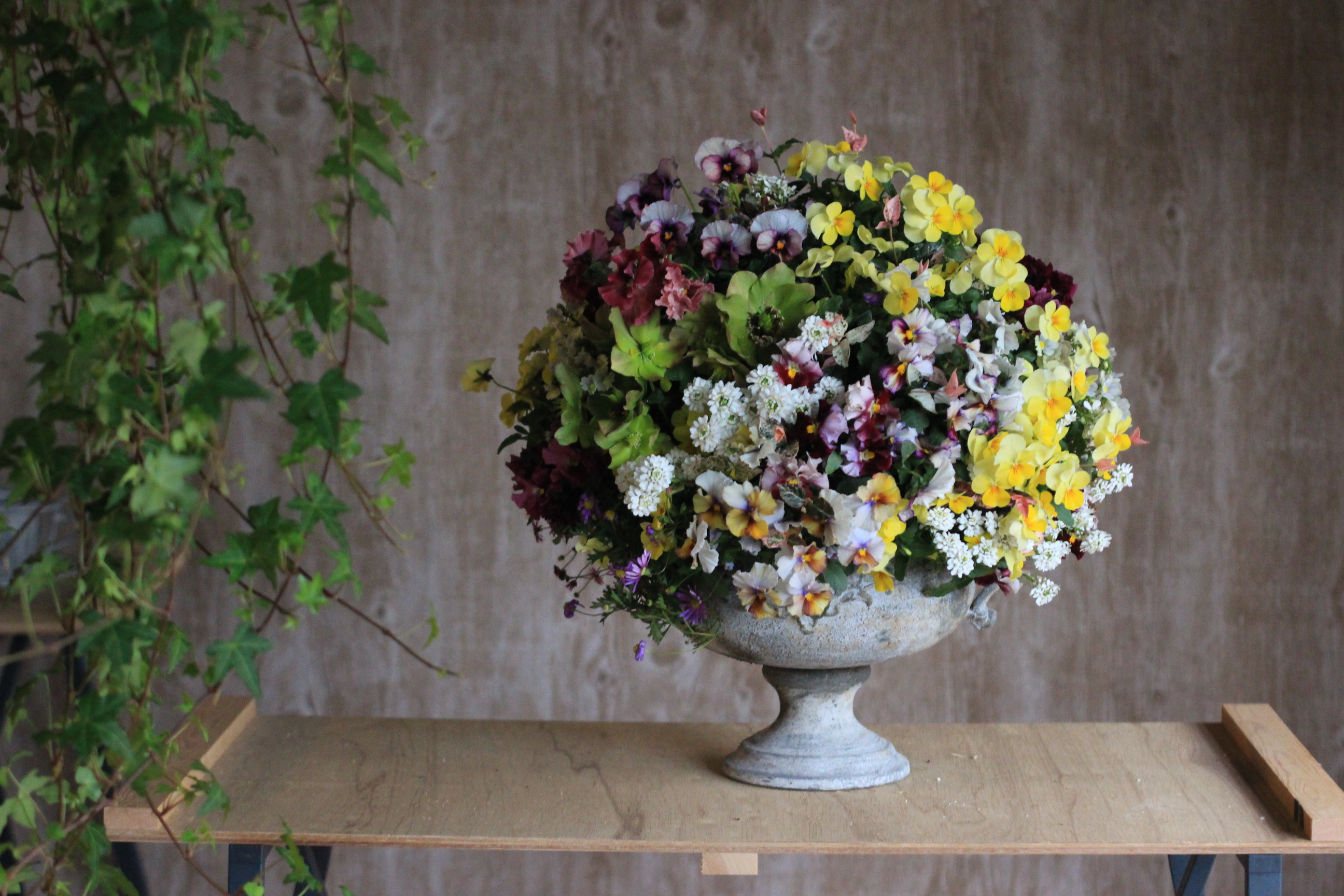 1月のステップアップレッスン課題はビオラで作る3段マウントスタイルのブリコラージュフラワーです。